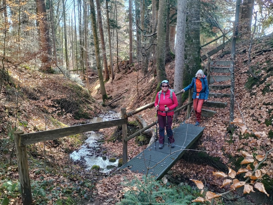| Tourenverlauf: | Vom Parkplatz ein kurzes Stück zurück in Richtung Waldbad, dann am Ende der Tennisplätze rechts in den Wald. Wo der Forstweg eine Linkskurve abwärts macht, rechts abbiegen und auf schmalem Weg zu den Häusern von Ehrhafts. Wir folgen der Teerstraße bis zum nächsten Gehöft, biegen dort links ab und gehen kräftig bergauf nach Straß. In der Linkskurve der Straße gehen wir geradeaus durch einen Hof und folgen dann dem Schotterweg leicht abwärts bis zur Abzweigung nach einer Buschreihe. Dort gehen wir vorbei an der großen Skulptur nach rechts abwärts nach Kenners und dann weiter auf der Straße nach Horben. In der Ortsmitte halten wie uns rechts (Ww. Huben), gehen abwärts, überqueren den Bach und erreichen die Straße in Richtung Lengersau. Wir gehen auf der Straße 50 m nach links und biegen am Waldrand scharf rechts ab auf den Weg, der steil aufwärts führt. Vorbei an einem Einzelhof steigen wir durch den Tobel hinauf zu einem verfallenen Gehöft und erreichen schließlich Schweineburg. Wir bleiben auf der Straße bis nach Aitringenberg, wo uns ein Wegweiser nach dem großen Anwesen nach rechts auf einen Schotterweg leitet. Wir folgen dem Weg hinab nach Rauen und weiter in Richtung Isny. Nach einem Stück am Waldrand biegen wir rechts in einen Schotterweg ein (Ww. Waldbad), den wir nach 300 m nach links verlassen. In weitem Bogen steigen wir aufwärts bis zum Weg, der nach links in Richtung Isny/Ludwigshöhe führt. Auf ihm gehen wir zum Waldrand dort nach rechts auf die Wiese. Weglos am Waldrand entlang kommen wir zur Downhill-Strecke der Felderhalde und erreichen die Höhe an dieser entlang den Aussichtspunkt mit dem Lohbauer-Denkmal. Am Waldrand weist uns der Wegweiser auf den Schotterweg zurück zum Waldbad, von wo wir nach rechts wieder die Tennisplätze und den Parkplatz erreichen. |