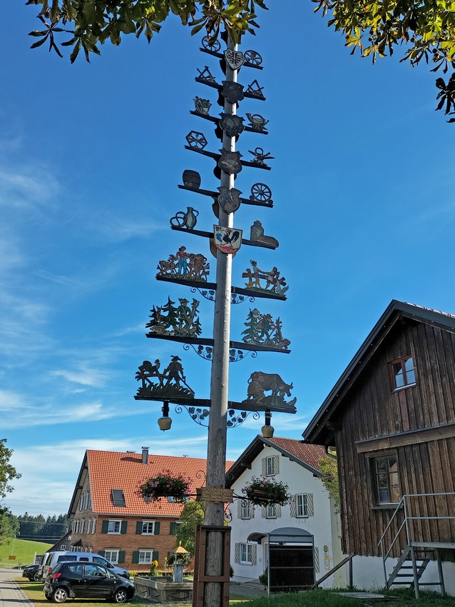 An der Bundestraße gehen wir nach rechts bis zur Bushaltestelle, überqueren die Straße und halten uns auf dem Wirtschaftssträßchen rechts. Immer auf dem schmalen Sträßchen gewinnen wir an Höhe und kommen schließlich nach Allmannsried. Hier genießen wir nochmals den Alpenblick, und biegen beim kleinen Häuschen links ab (Ww. Gretenmühle).