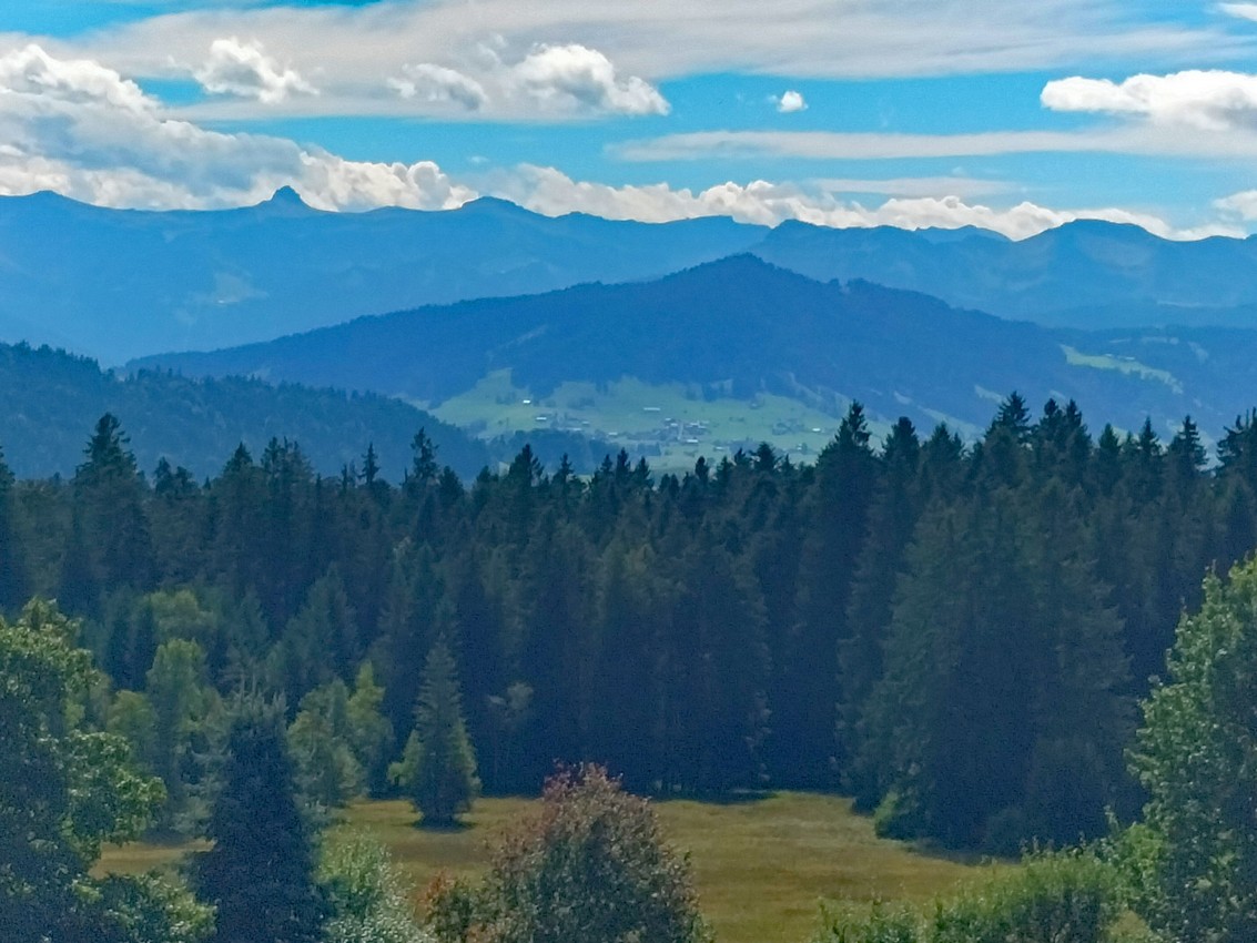 Weiter gehen wir durch den Wald in Richtung Pfänder, bis sich kurz vor Bromatsreute in einer Lichtung der Weg gabelt. Wir biegen hier links ab (NICHT in Richtung Bromatsreute/Pfänder) in Richtung Hagspiel/Lindenau und genießen nach Verlassen des Waldes einen herrlichen Blick auf die Nagelfluhkette, die Allgäuer Alpen und die Berge um die Damülser Mittagsspitze.