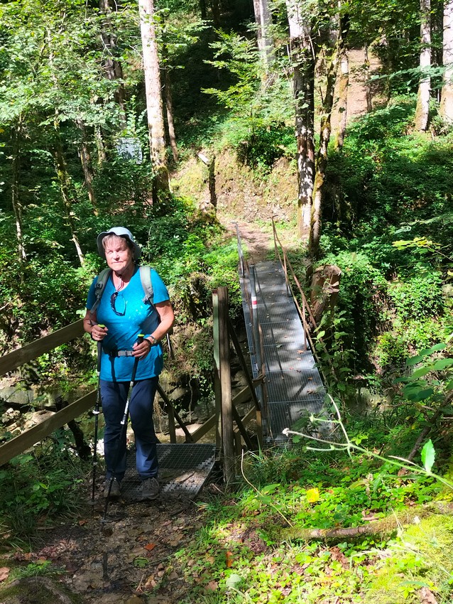 Vom Parkplatz steigen wir vorbei am Kurhaus auf dem Wanderpfad entlang einer Baumreihe hinauf zur Straße in Richtung Sky-Walk. Dort gehen wir ca. 150 m nach links und biegen dann auf den halblinks abzweigenden Wanderpfad ein.