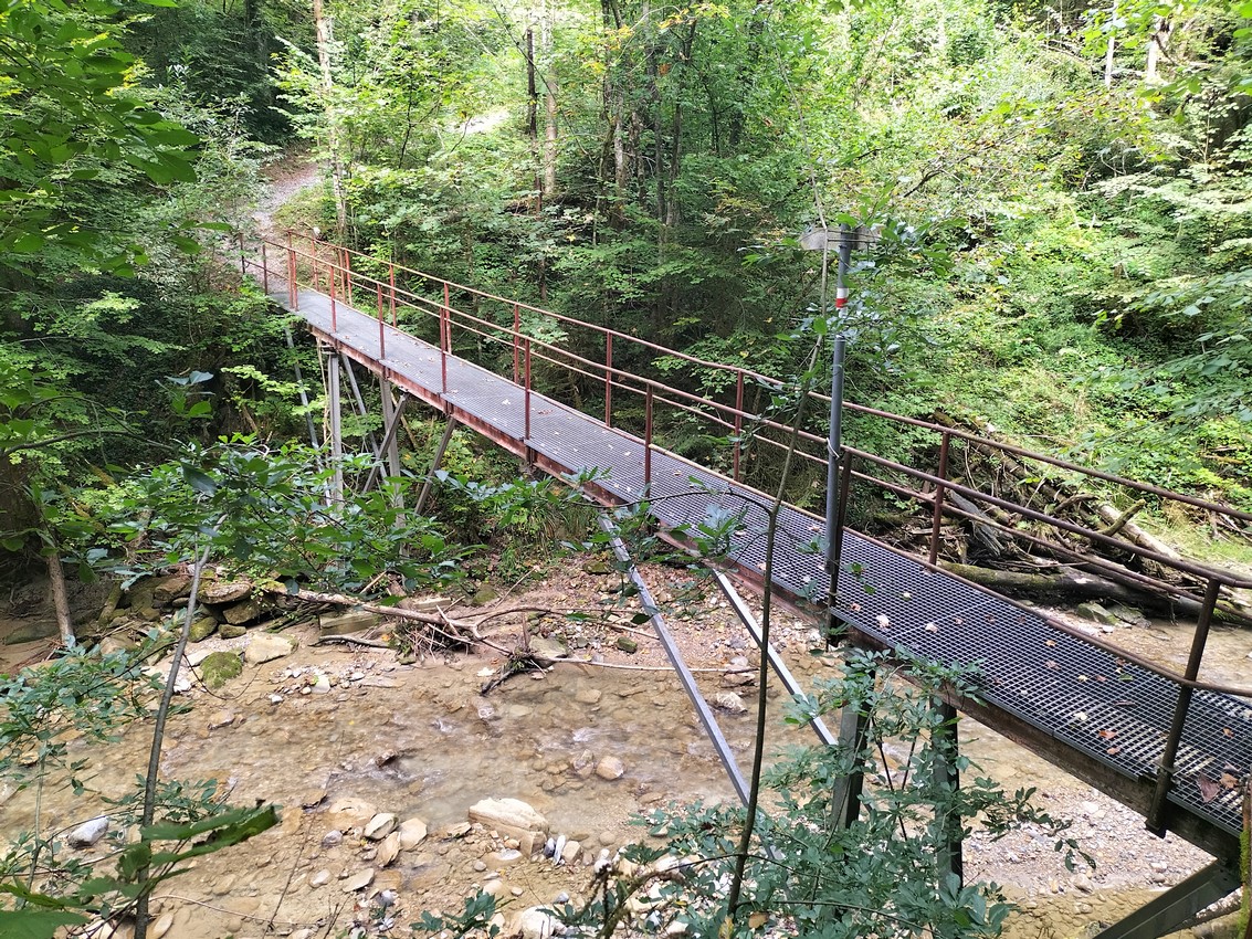 Wir folgen der Bergstraße aufwärts durch die Wohnsiedlung, verlassen die Bebauung und erreichen einen Parkplatz. Kurz danach weist uns der Wegweiser nach links in Richtung Kurhaus, das wir nach einem kurzen, steilen Abstieg erreichen.