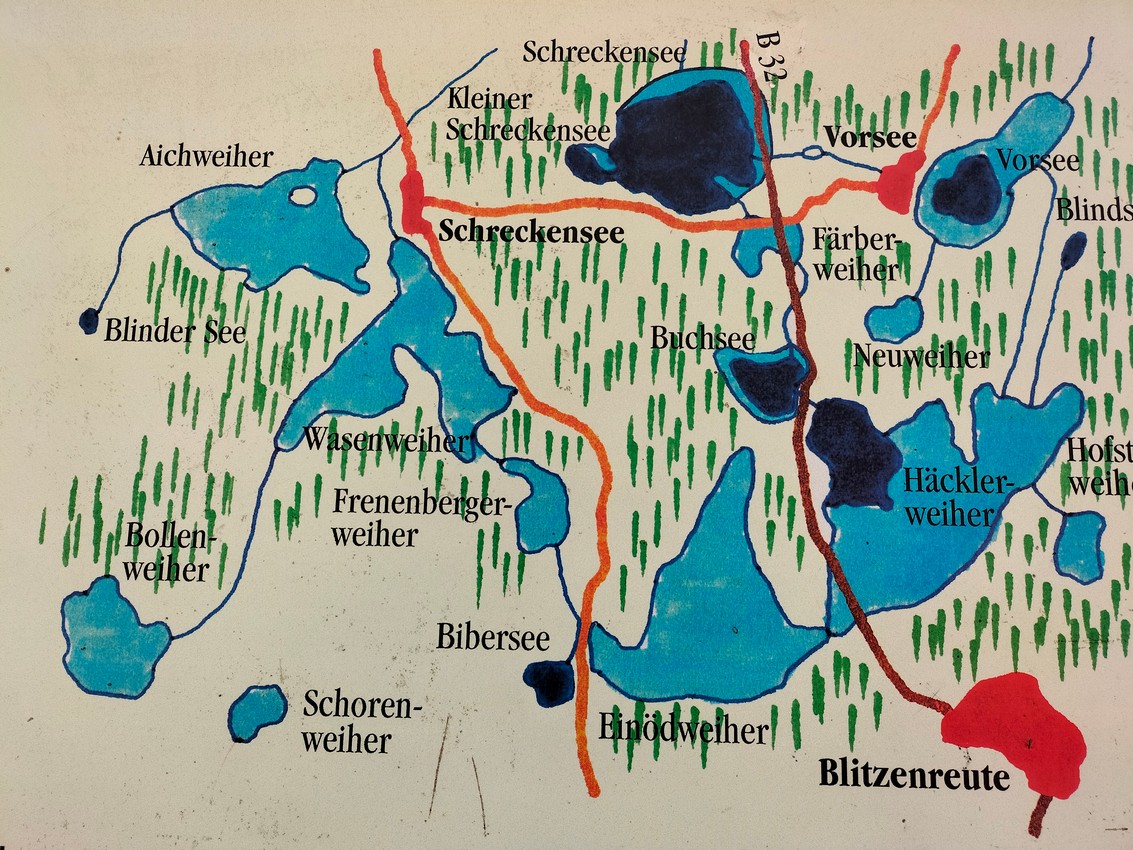 b. Auf der B32 durch Blitzenreute und weiter bis zum großen Parkplatz am Häcklerweiher