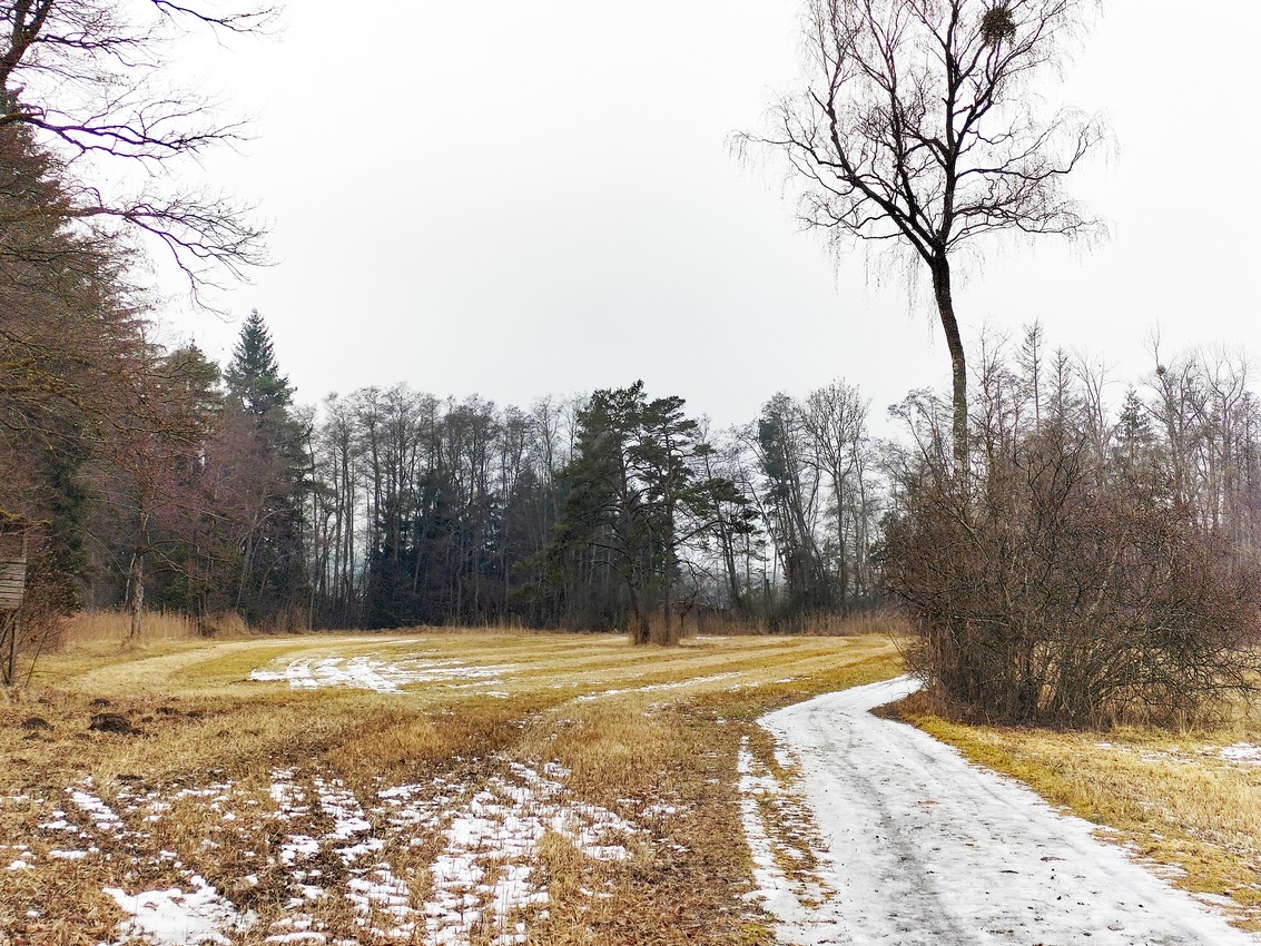 Nach dem Bohlenweg (Vorsicht bei Nässe oder Eis!) biegen wir links ab und folgen in leichter Steigung dem Grasweg am Waldrand und durch Wiesen.