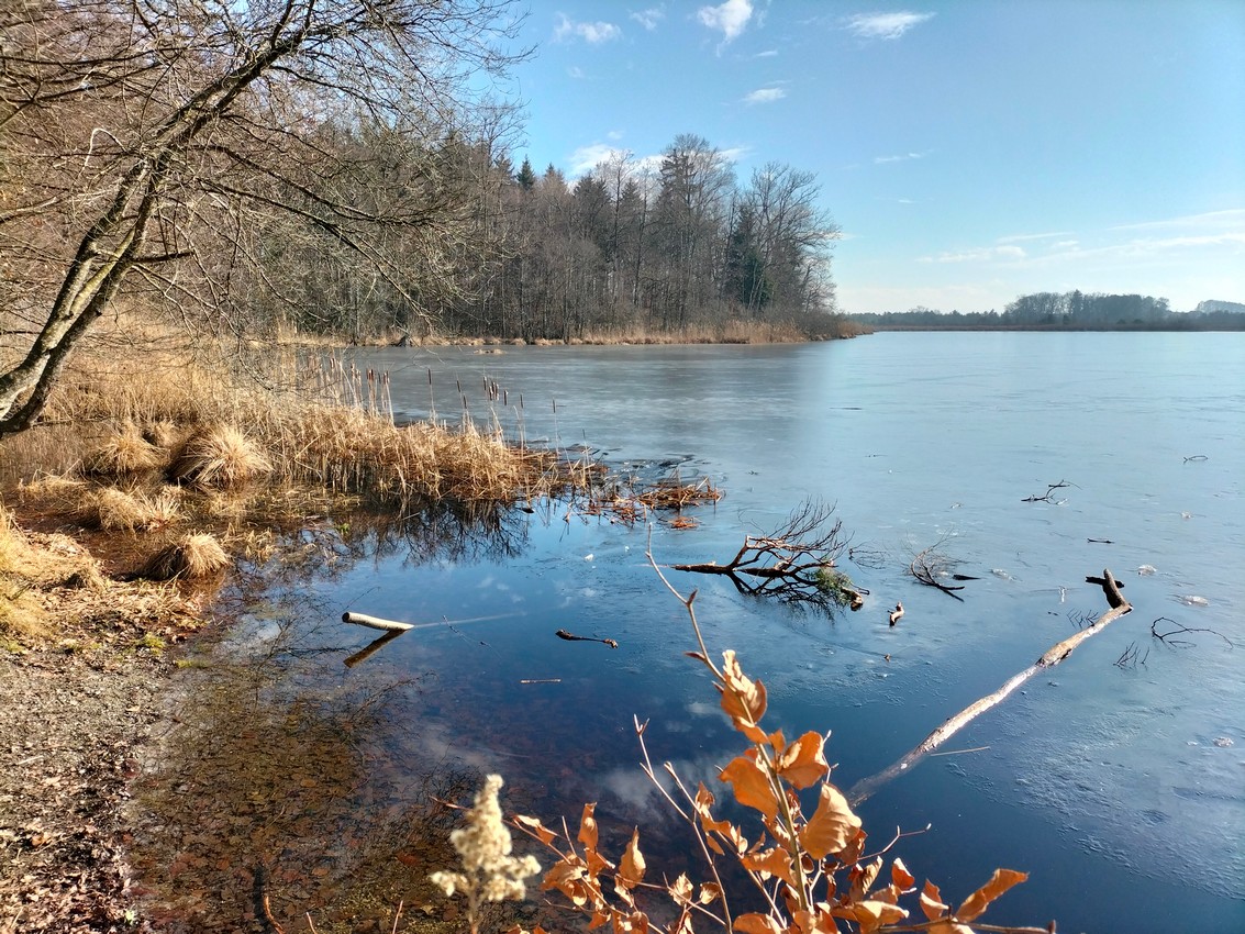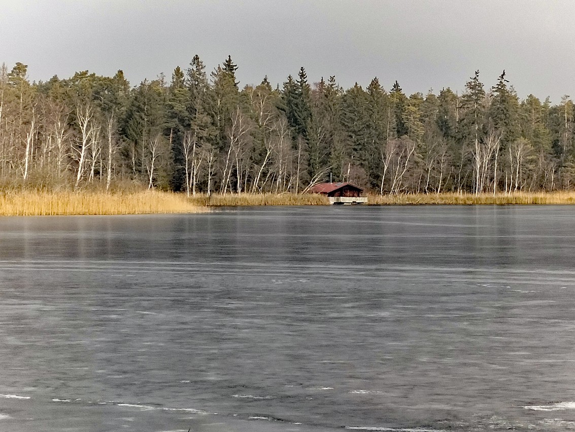 Wir überqueren die B32, gehen durch ein Waldstück und biegen nach der freien Fläche links ab. Der Wldweg geht nach einem Bootshaus (?) in einen schönen Pfad über, auf dem wir eine Beobachtungshütte am See erreichen.