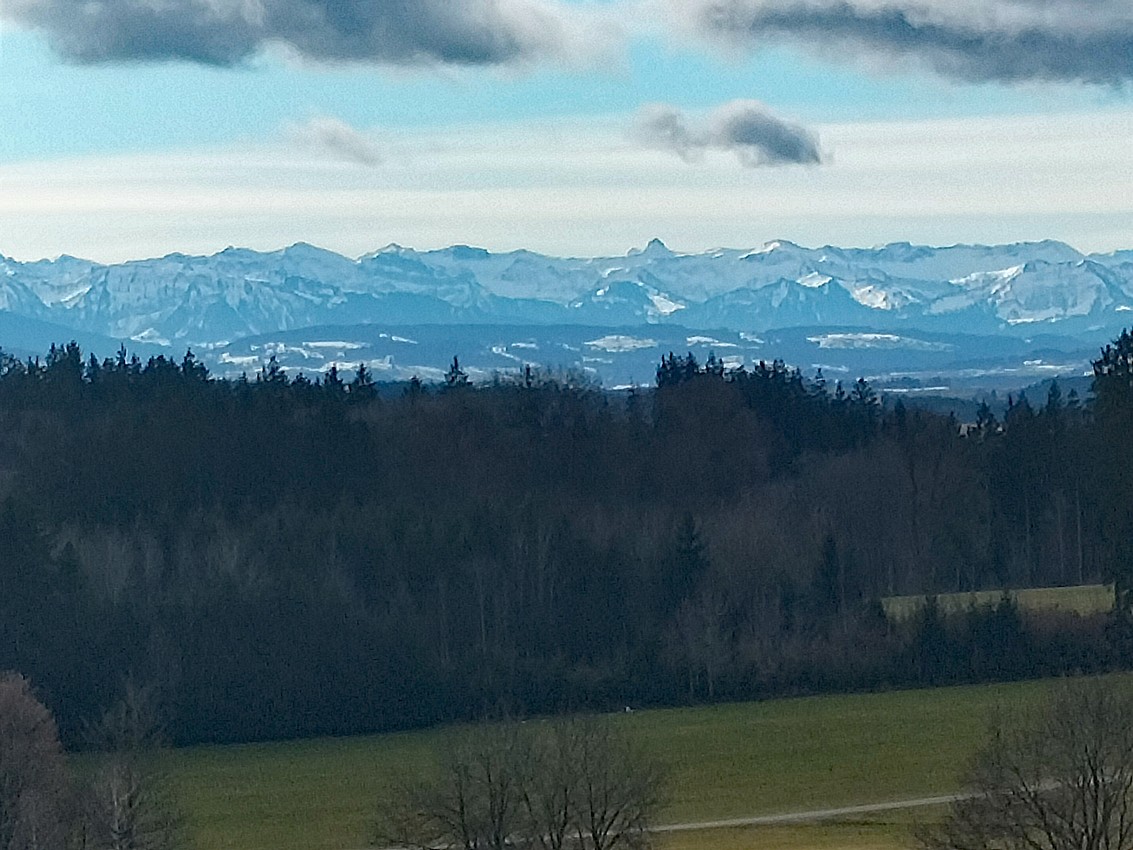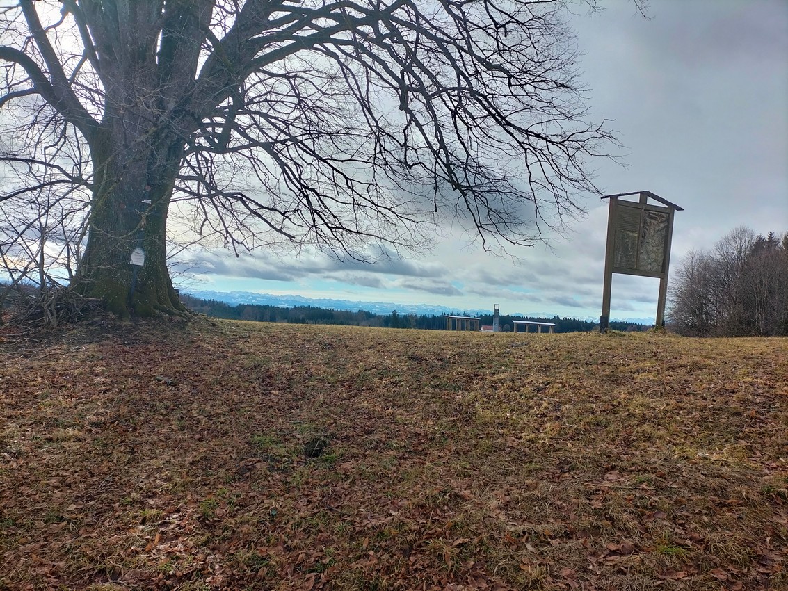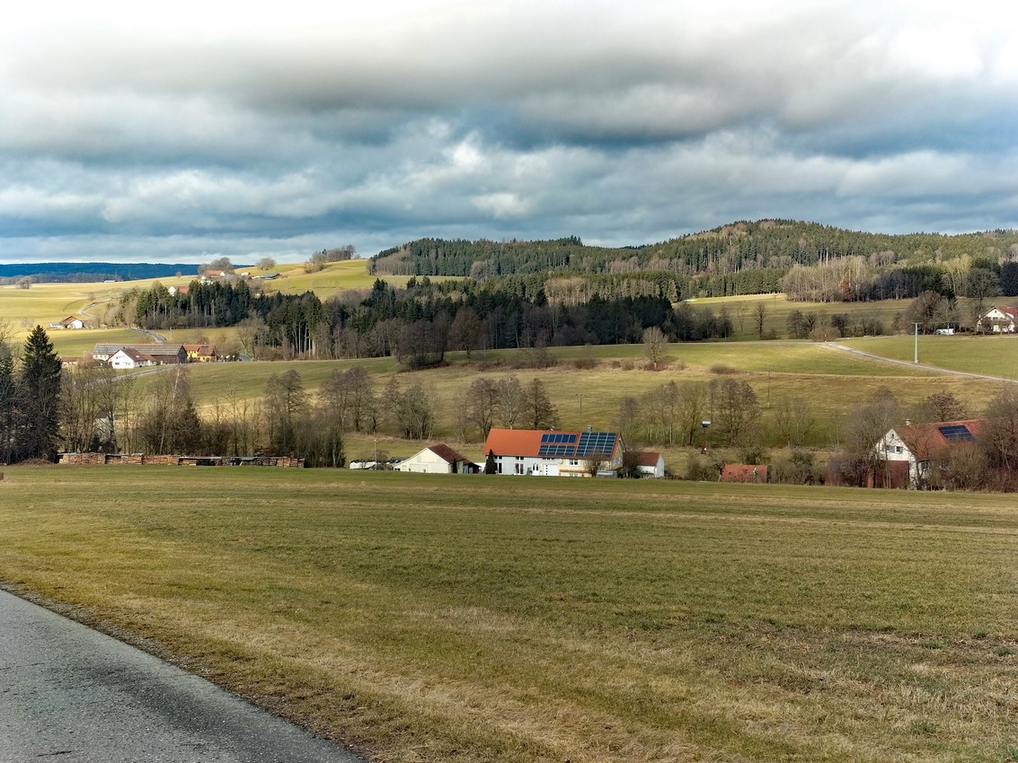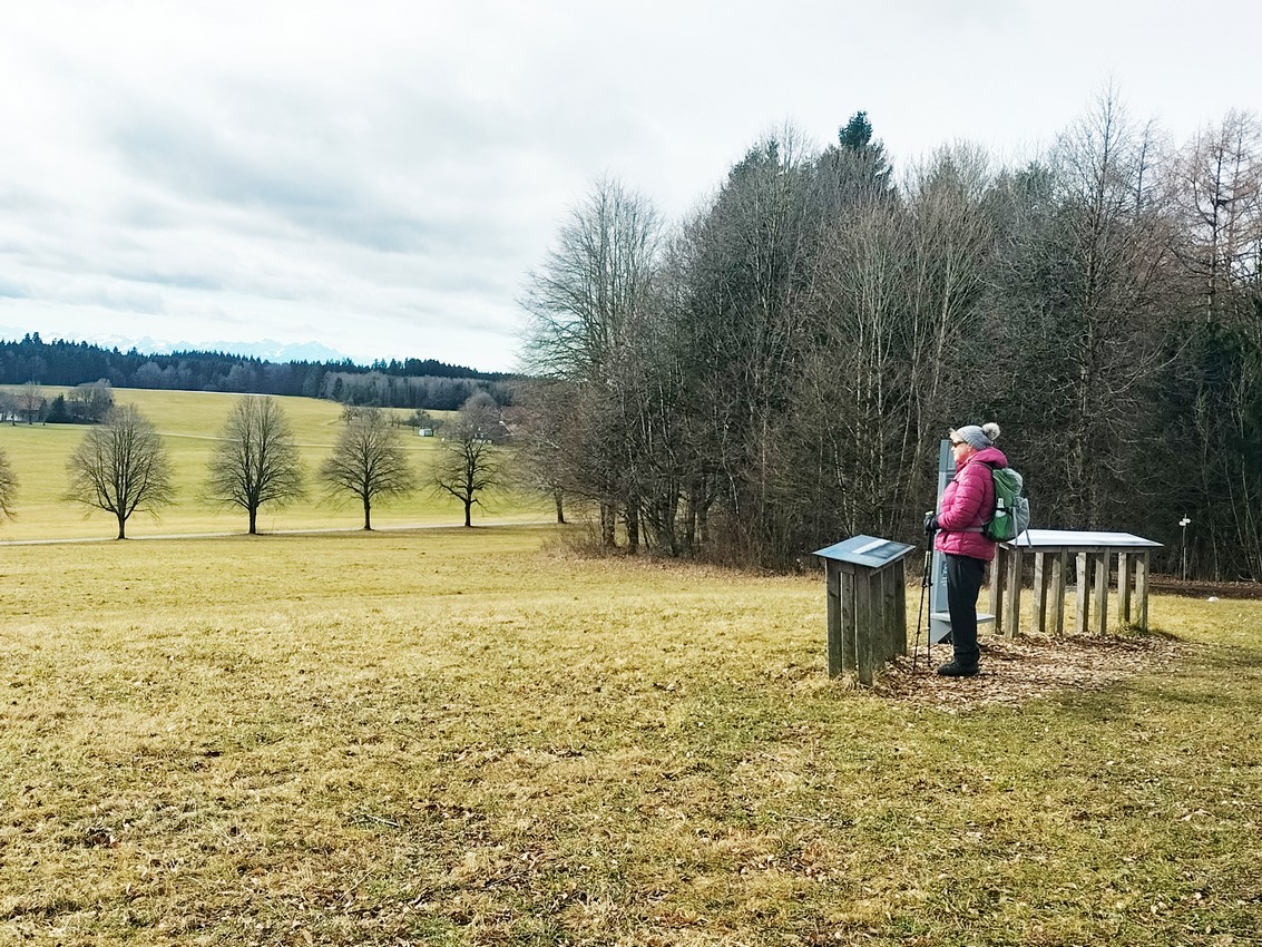 Nachdem wir ausgiebig die grandiose Aussicht genossen haben, wandern wir wieder zurück zur Wegespinne, halten uns dort halblinks und bleiben auf dem Sträßchen bis zum folgenden Hof. Dort verlassen wir die Straße, gehen zum Hof, dort rechts am Gebäude vorbei und auf dem Feldweg zum Waldrand. Nach einem Stück im weiten Linksbogen am Wald entlang geht es nach rechts zur Straße, die wir überqueren.