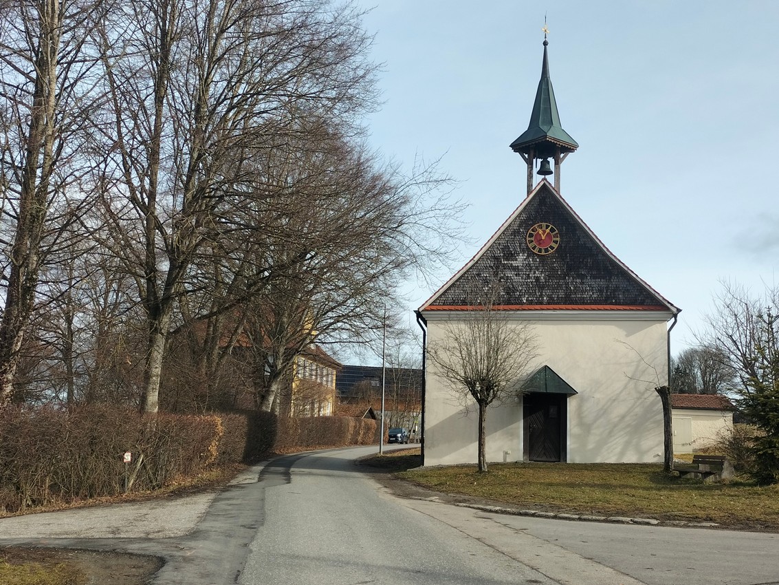 Tourenverlauf: Wir gehen vom Parkplatz in Richtung Ort und überqueren die Kreisstraße (Ww. Aussichtspunkt Wachbühl, Nr. 10). Auf schmalem Sträßchen steigen wir bergauf in Richtung Wald. Durch den Wald, dann vorbei am „Bergjock“ kommen wir auf dem Sträßchen nach Starkenhofen, wo wir duch den Ort bis zur Kapelle gehen.