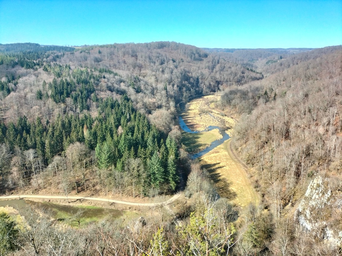 Am Fuß des Turms steigen wir auf sehr steilem Wurzelpfad ein Stück ab und folgen dann nach links den Markierungen von HW5 und Burgenweg am Hang entlang. Vorbei an der kaum sichtbaren Ruine Monsberg erreichen wir das Lautertal Hier gehen wir nach links, überqueren dann auf schmaler Brücke die Lauter und gehen vorbei an Unterwilzingen. Wir überqueren am Ortsende nochmals die Lauter und biegen unmittelbar nach der Brücke rechts ab. Im romantischen Lautertal erreichen wir schließlich die Laufenmühle und den Ausgangspunkt. Unterwegs können wir eine kleine Variante einlegen, indem wir den ausgeschilderten Wasserpfad benutzen.